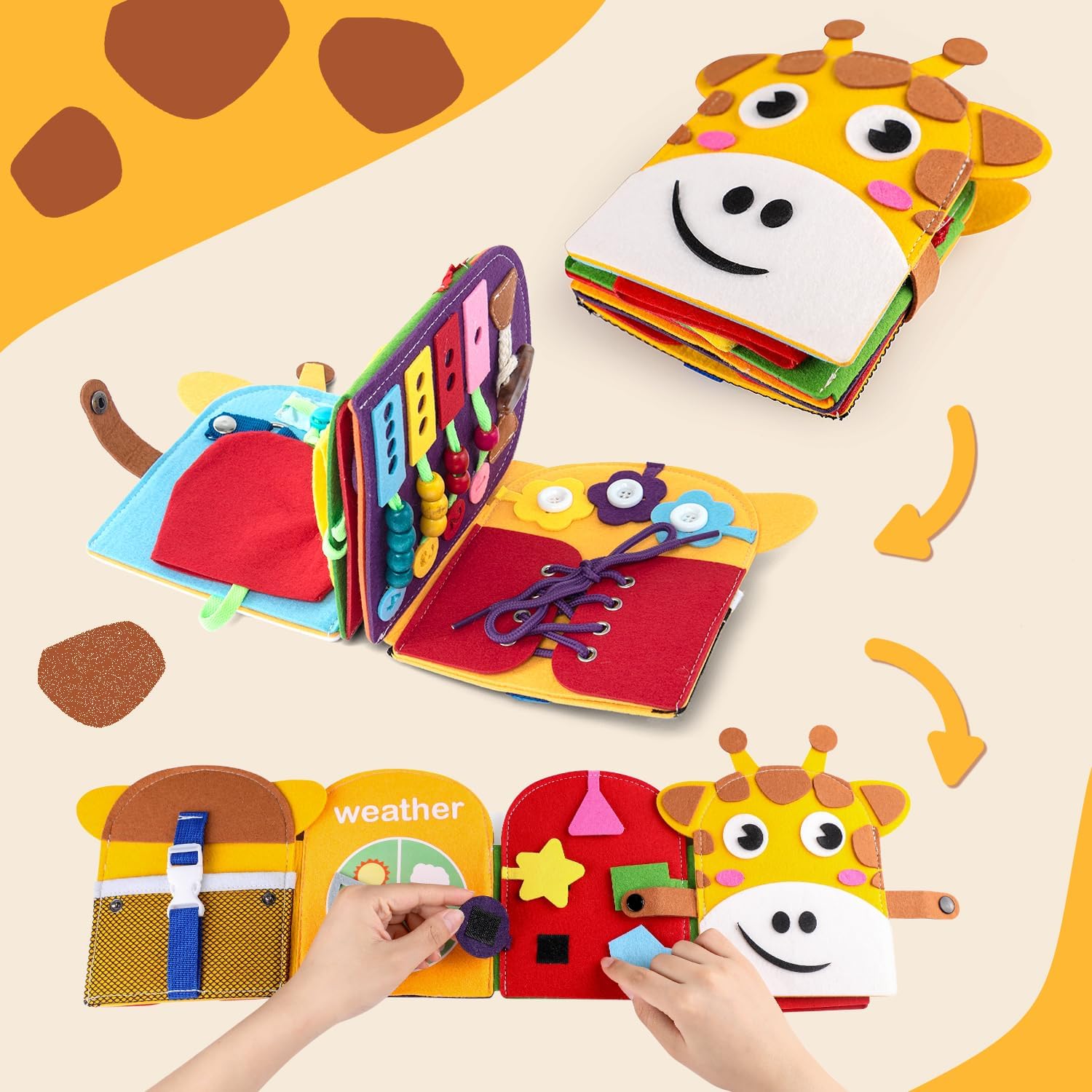 The quiet and silent design, perfectly reasonable size and weight make our giraffe felt book perfect for carrying on the go, suitable for long trips, churches, restaurants, airplanes and other scenarios. If you are worried that your baby will easily get bored with traditional baby toys that do not help their intellectual development and have a single way to play, then our quiet book is just what you need to grab your tiny one's attention and introduce him/her to a whole new world of fun.