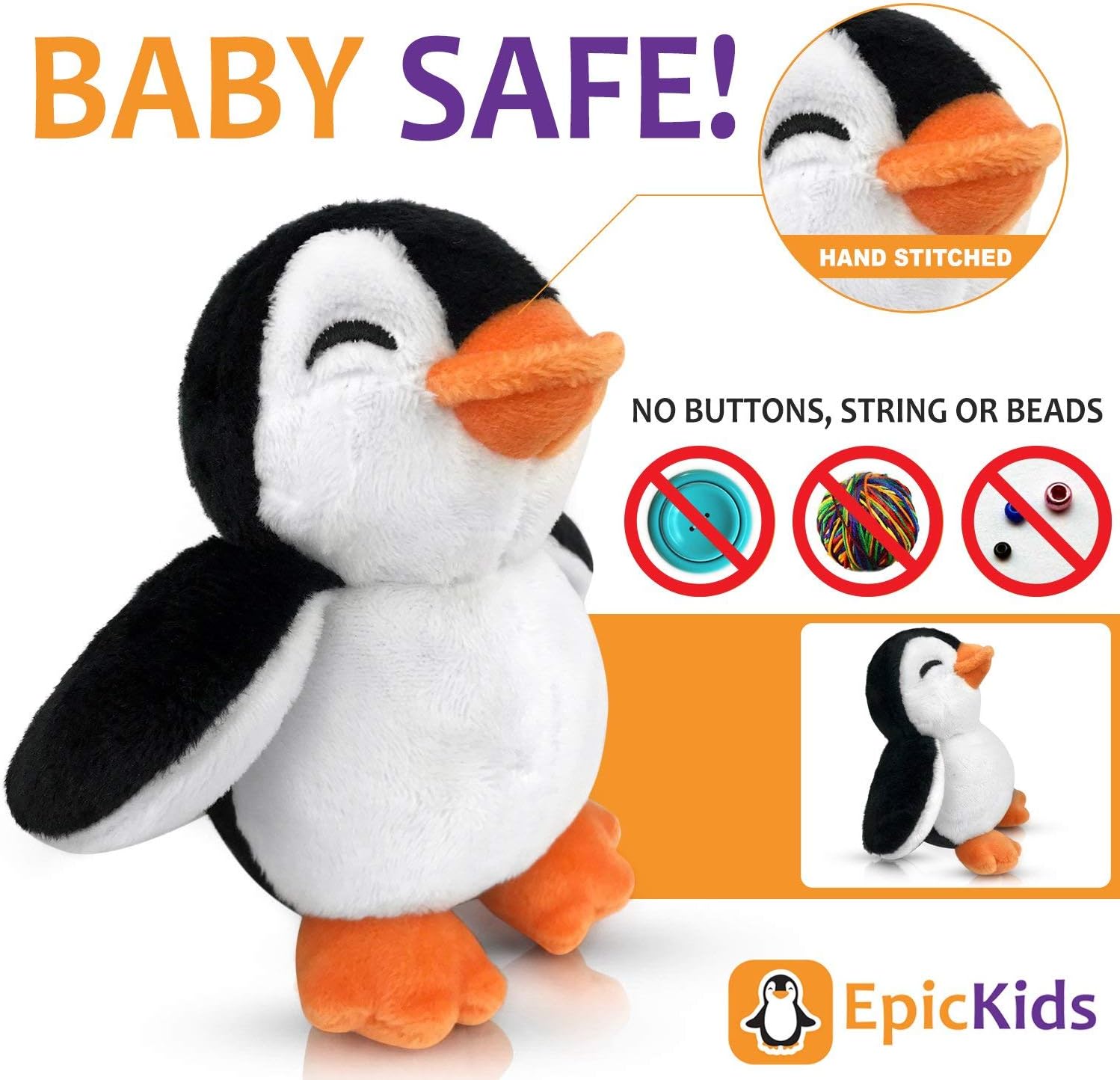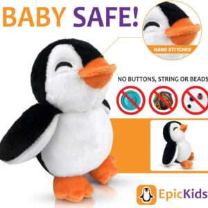 EpicKids is proud to present our new stuffed animal to you… a cute 5-inch stuffed penguin. He is appropriate for babies and toddlers since he doesn't have any buttons or beads on him. Your child's safety is our top concerns, so all of our stuffed animals have embroidered eyes and nose details.