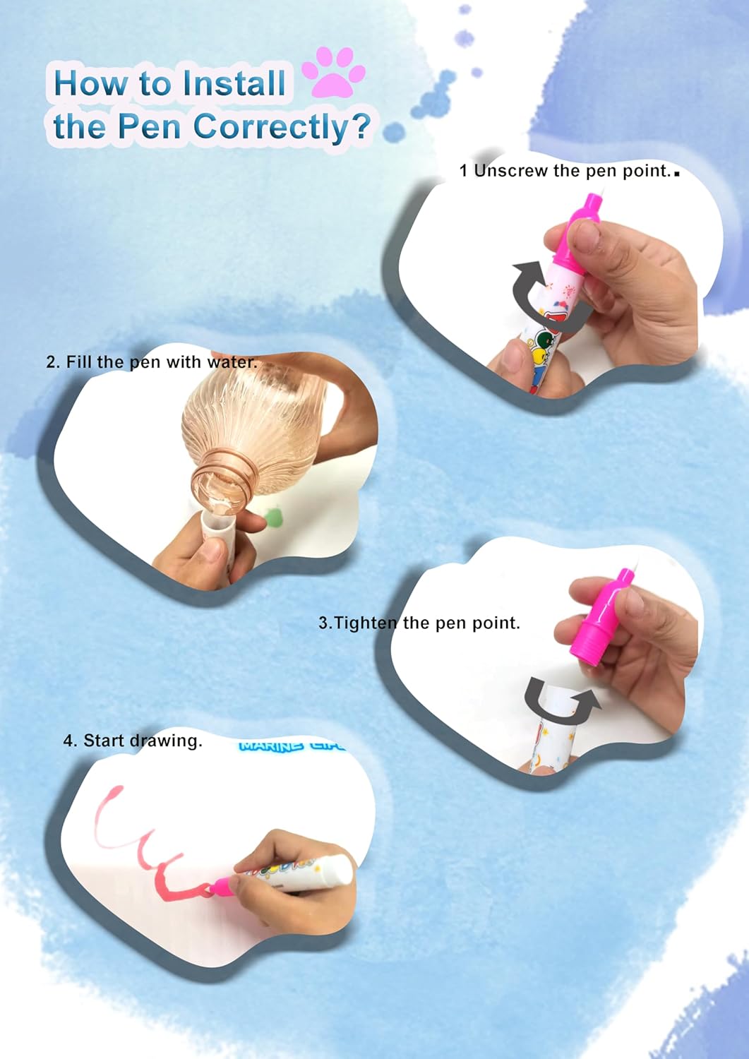- Endless Reusable Fun:Drawings disappear when dry, allowing unlimited painting sessions. No ink, no chemicals – just refill the water pen to create vibrant artwork again and again. Eco-friendly alternative to paper coloring books